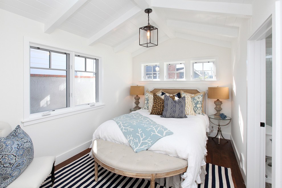 В маленьком помещении желательно продумать, как визуально расширить пространство с помощью светлых тонов. Большую спальню обязательно немного раздробить с помощью контрастов, чтобы она не выглядела пустой.