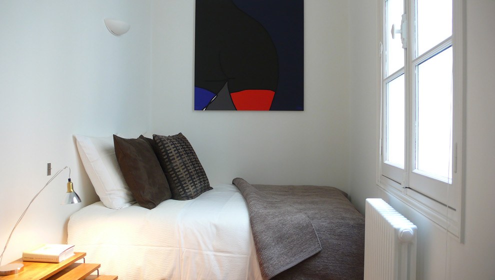 Современная светлая спальня с ламинатом на стене и ковролином на полу