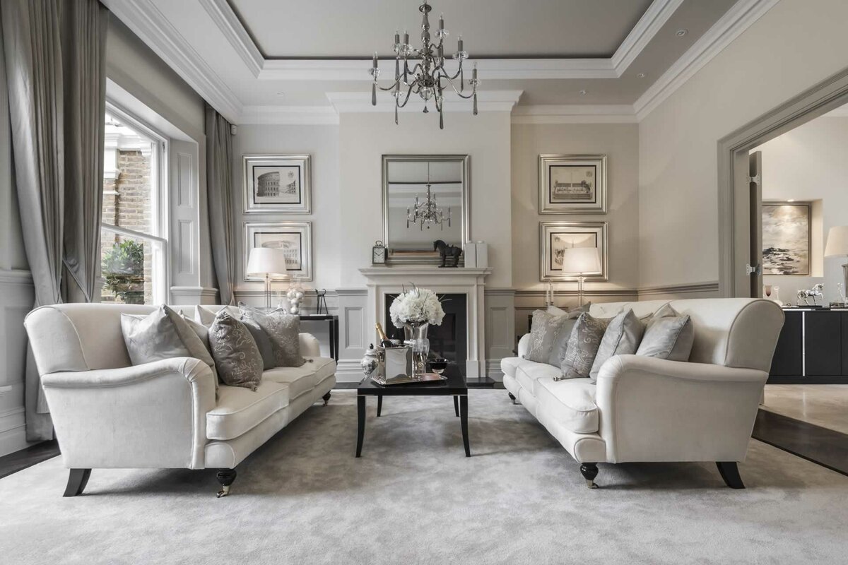 Чаще всего красивые интерьеры квартир в классическом стиле начинаются с просторной гостиной с высокими потолками – здесь проходят «приемы», или посиделки с друзьями и родственниками.