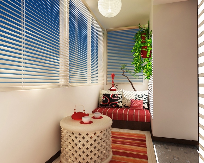 Красивые шторы или жалюзи придадут балкону уютный вид